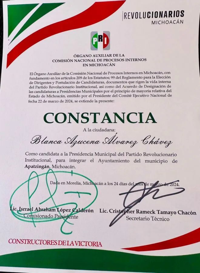 Morelia, Michoacán, 24 de Marzo del 2024.- El Órgano Auxiliar de la Comisión Nacional de Procesos Internos del Partido Revolucionario Institucional (PRI), entregó la constancia que acredita a Blanca Azucena Álvarez Chávez, como candidata a la presidencia municipal de Apatzingán.