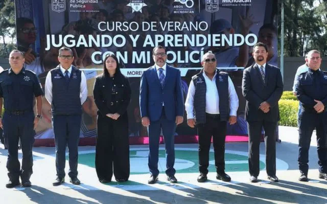 Morelia, Michoacán, 5 de agosto de 2024.- Cerca de 300 niños y niñas iniciaron este día el curso de verano denominado, Jugando y aprendiendo con mi policía, con el pase de lista de la Guardia Civil en la explanada de la Secretaría de Seguridad Pública (SSP).