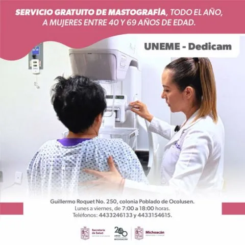 Para ello pone a disposición sus unidades fijas ubicadas en los hospitales Dr. Miguel Silva y de la Mujer, en Morelia; así como los de Zamora, Zitácuaro y Uruapan. También está la Unidad de Especialidades Médicas para la detección temprana de cáncer de mama (Uneme Dedicam) y el Centro Estatal de Atención Oncológica (CEAO), donde las usuarias pueden acudir a realizarse su estudio totalmente gratuito.