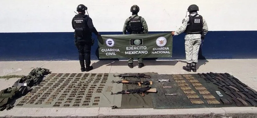Luego de realizar labores preventivas en una zona rural de la localidad de Felipe Carrillo Puerto (La Ruana), municipio de Buenavista, los agentes de la Guardia Civil, Ejército Mexicano y Guardia Nacional (GN), localizaron las armas de fuego, cargadores y cartuchos de diversos calibres, así como el equipo táctico.