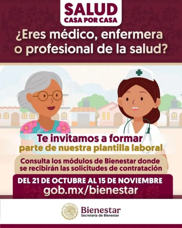 Ciudad de México, 16 de octubre de 2024.- En cumplimiento del compromiso de la presidenta Claudia Sheinbaum con el pueblo de hacer valer el derecho a la salud, la secretaria de Bienestar, Ariadna Montiel Reyes, convoca a médicas, médicos, enfermeras, enfermeros y profesionales de la salud a participar en el programa Salud Casa por Casa que brindará atención y seguimiento médico a derechohabientes de Pensiones para el Bienestar de las Personas Adultas Mayores y con Discapacidad; las personas que se contraten realizarán trabajo en campo visitando periódicamente los domicilios para proporcionar atención personalizada.
