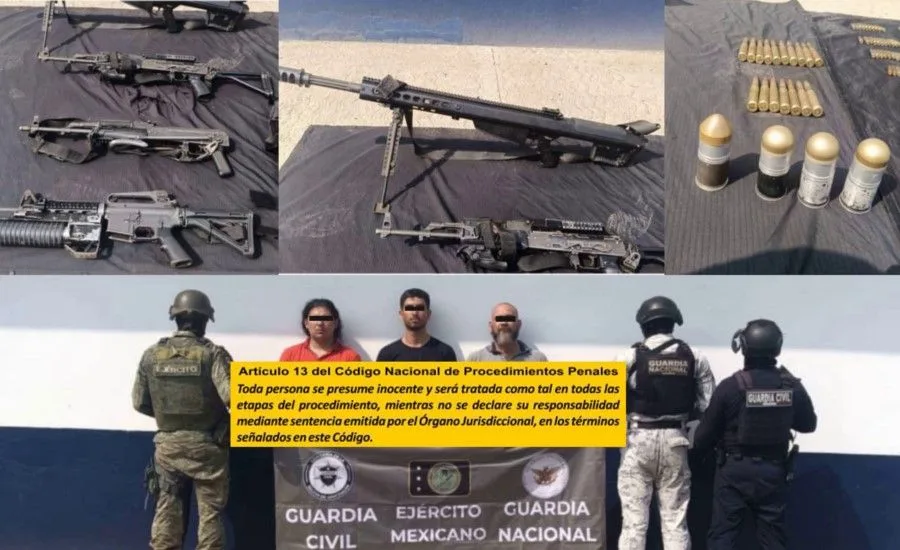 Apatzingán, Michoacán, 3 de noviembre del 2024.- Elementos de las secretarías de Seguridad Pública (SSP) y de la Defensa Nacional (Sedena), así como de la Guardia Nacional (GN), detuvieron en la localidad de El Molinito, municipio de Apatzingán a tres personas que se identificaron con como: Roberto A. F. de 41 años, Víctor Manuel R. M. de 25 años y Roberto N. G. de 35 años, una de ellas, objetivo delincuencial de la región; además, se aseguraron, ocho granadas y un Barret.