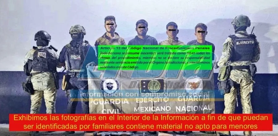 A los detenidos se les aseguró cuatro Fusiles calibre 7.62X39, 545 proyectiles calibre 7.62X39, veinte cargadores para ese calibre, además equipo Táctico, 4 chalecos porta placas, 8 Placas balísticas y 4 percheras.
