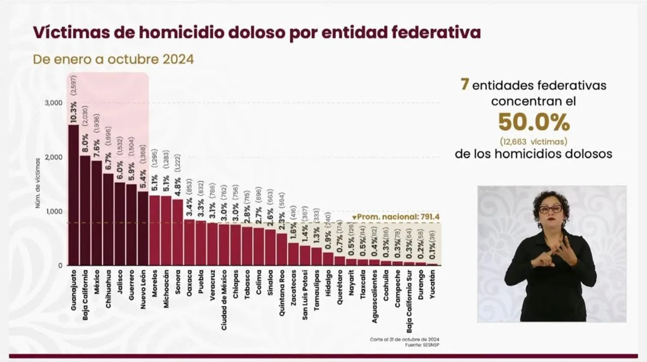 Ciudad de México, 12 de noviembre de 2024.- Michoacán ha quedado fuera de los cinco estados con mayor número de incidencia de homicidios dolosos, informó durante la conferencia presidencial de este martes la titular del Secretariado Ejecutivo del Sistema Nacional de Seguridad Pública (SESNSP), Marcela Figueroa Franco.