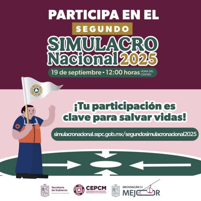 Morelia, Michoacán, 17 de septiembre de 2025.- La Coordinación Estatal de Protección Civil convoca a participar en el Segundo Simulacro Nacional 2025, que se llevará a cabo el próximo 19 de septiembre a las 12:00 horas, con el propósito de fomentar la cultura de la autoprotección y fortalecer las capacidades de reacción de las brigadas internas en instituciones públicas y privadas.