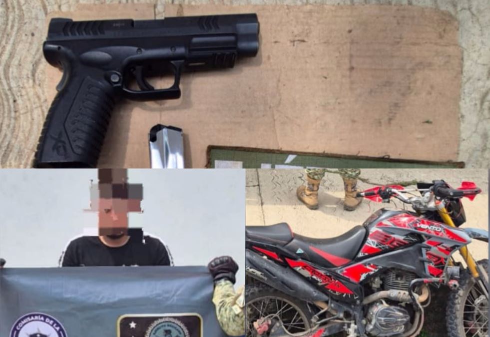 Al momento de su detención, se le aseguró una pistola marca Springfield Armory USA, calibre 9 milímetros, con un cargador abastecido con 10 cartuchos útiles. Asimismo, se le incautó una motocicleta marca Vento Cross Max 300, color negro con rojo, la cual carecía de placa de circulación y, hasta ese momento, no contaba con reporte de robo.