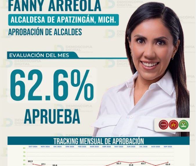 Apatzingán, Michoacán, 6 de Octubre de 2025. – Con un estilo de gestión caracterizado por la cercanía y los resultados tangibles, la Presidenta Municipal de Apatzingán, Fanny Arreola Pichardo, ha sido confirmada como la alcaldesa mejor evaluada de Michoacán, según el riguroso estudio de la firma Demoscopía Digital, publicado por el prestigiado diario Reforma.