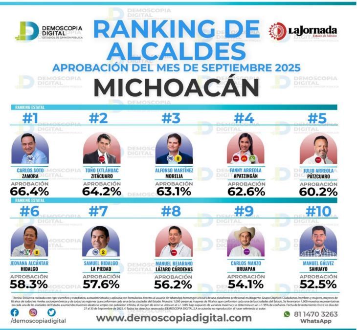 La solidez de su gestión se hace aún más patente al desglosar el ranking general, donde se elimina la distinción de género. En el estudio estatal, la alcaldesa de Apatzingán se asegura un lugar en el exclusivo «Top 5«, al colocarse en la cuarta posición entre los 20 alcaldes de todos los partidos, (mujeres y hombres) mejor evaluados de Michoacán. Este puesto la convierte en la única mujer entre los diez primeros lugares, un hecho que resalta en un panorama político donde el liderazgo femenino sigue abriéndose paso con perseverancia y capacidad.