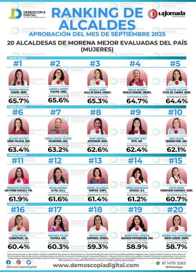 El anuncio, difundido a través de las plataformas digitales de la empresa de estudios de opinión, no se limita a un reconocimiento estatal. El informe revela que Arreola Pichardo no solo lidera con solvencia la evaluación entre sus homólogas mujeres en la entidad, sino que irrumpe con fuerza en el panorama nacional, posicionándose como la octava alcaldesa mejor evaluada de todo el país entre las afiliadas al partido Morena, un dato que subraya su creciente influencia y el modelo de gobierno que representa.