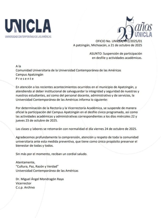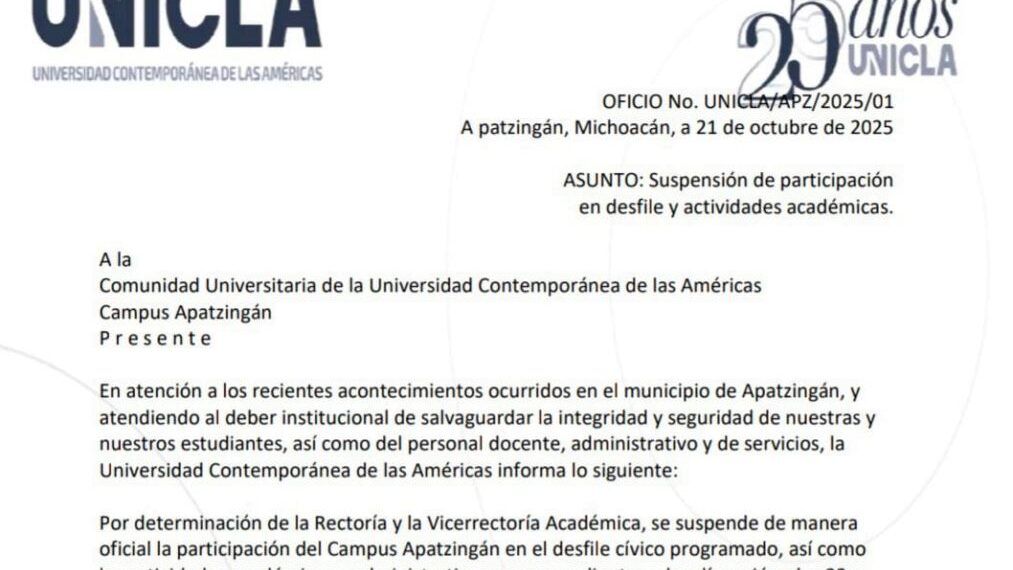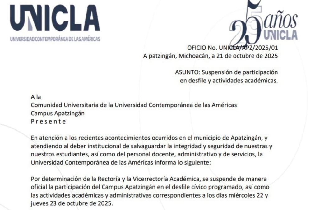 Apatzingán, Michoacán, 21 de Octubre de 2025.- Ante los recientes acontecimientos registrados en el municipio de Apatzingán, la Universidad Contemporánea de las Américas (UNICLA), Campus Apatzingán, tomó la decisión de suspender de manera oficial su participación en el desfile cívico programado y todas las actividades correspondientes a los días 22 y 23 de octubre de 2025.