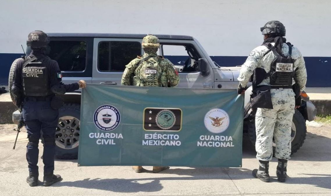 La acción se llevó a cabo durante patrullajes de vigilancia realizados como parte de la Estrategia Nacional de Seguridad Pública. Entre el material asegurado se encuentra 1 vehículo con reporte de robo, 20 cargadores de distintos calibres, 108 cartuchos útiles, 3 chalecos tácticos.