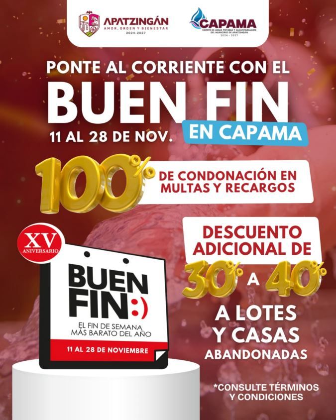 Apatzingán, Michoacán, 12 de noviembre de 2025. – El Comité de Agua Potable y Alcantarillado del Municipio de Apatzingán (CAPAMA), encabezado por su director Luis Naranjo, anunció el inicio de una campaña especial con motivo del «Buen Fin», la cual incluye beneficios sin precedentes para los usuarios, especialmente para aquellos con adeudos antiguos.