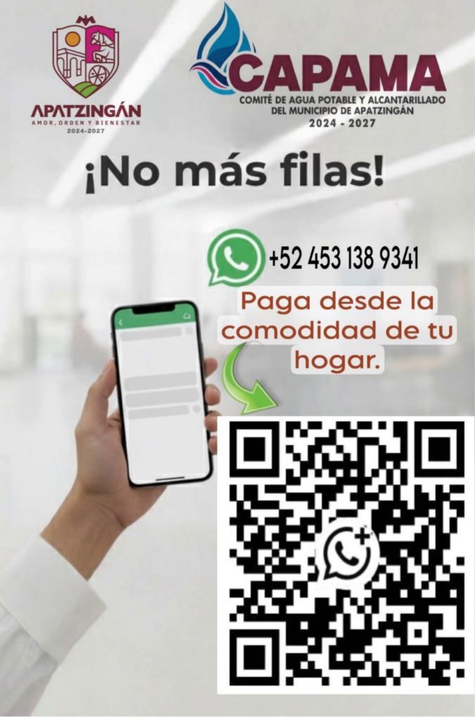 Para facilitar el proceso y evitar filas, CAPAMA ha implementado un moderno sistema de pago vía WhatsApp. Los usuarios pueden contactar al número 4538 9341 en horario de atención de 9:00 a 15:00 horas, de lunes a viernes, para recibir asesoría y el número de cuenta bancaria para realizar transferencias.
