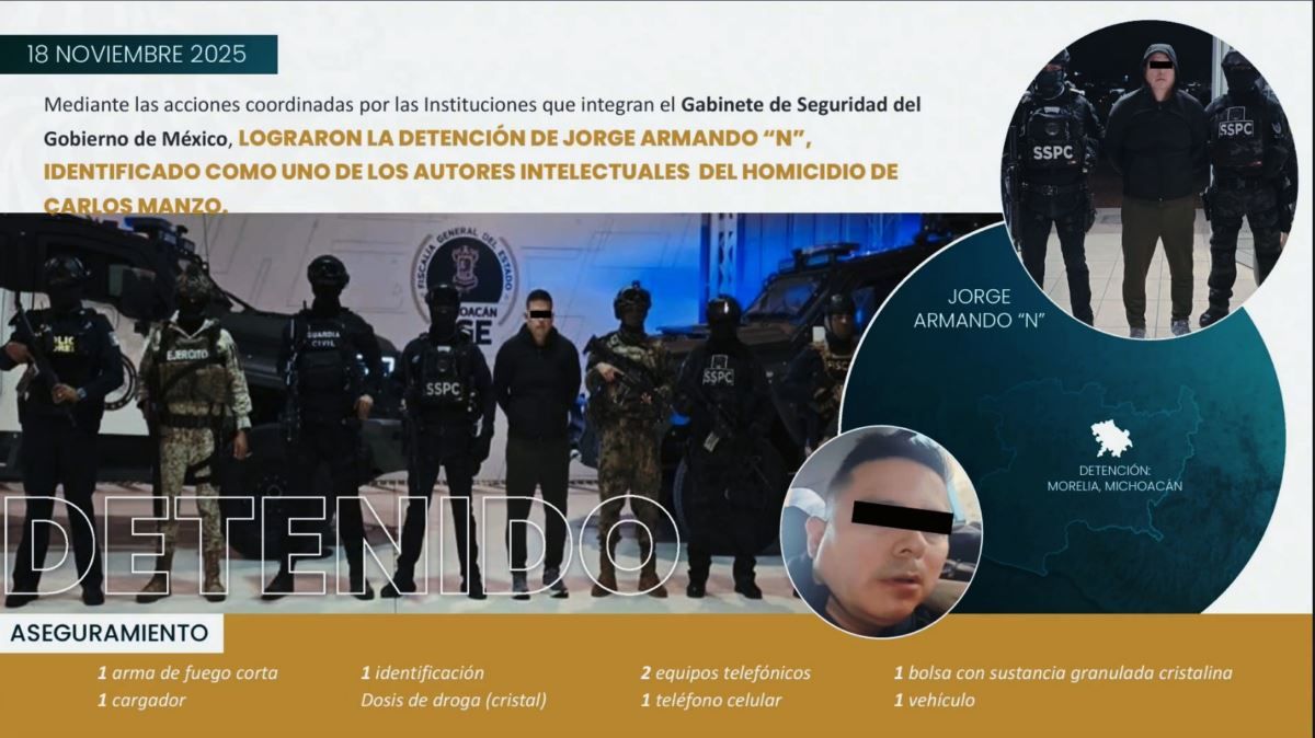 Morelia, Michoacán, 19 de Noviembre del 2025 – En un operativo coordinado en el Centro Histórico de Morelia, fue detenido Jorge Armando N., señalado como uno de los presuntos autores intelectuales del asesinato del alcalde de Uruapan, Carlos Manzo Rodríguez. El titular de la Secretaría de Seguridad y Protección Ciudadana (SSPC), Omar García Harfuch, fue el encargado de informar sobre este significativo arresto.