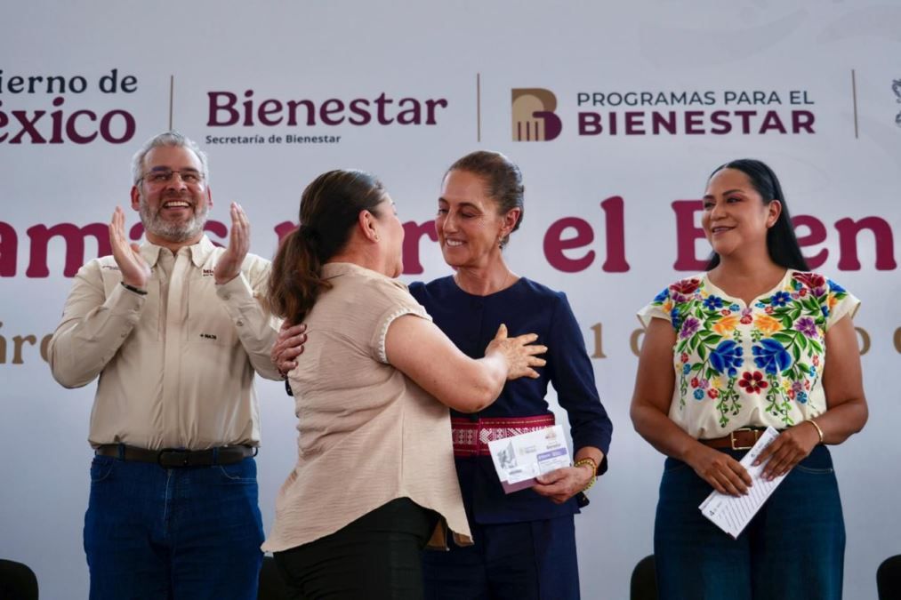 A nivel nacional, dijo, se impulsan nuevos programas como: LA PENSIÓN MUJERES BIENESTAR, QUE RECONOCE TODA UNA VIDA DE TRABAJO; SALUD CASA POR CASA SE IMPLEMENTA A TRAVÉS DE SERVIDORAS Y SERVIDORES DE LA SALUD, PORQUE LA SALUD ES UN DERECHO; LA BECA “RITA CETINA” SE HIZO UNIVERSAL PARA ESTUDIANTES DE SECUNDARIA PARA QUE NADIE ABANDONE LOS ESTUDIOS POR FALTA DE RECURSOS.