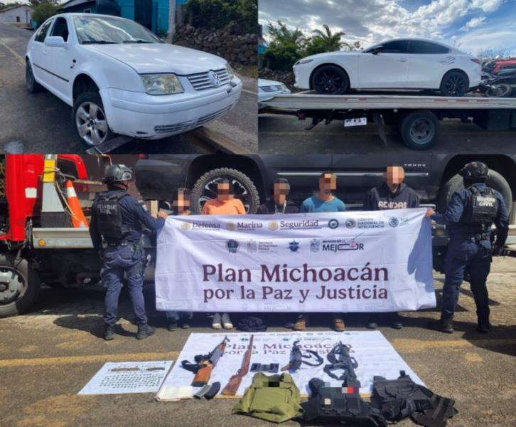 Morelos, Michoacán, 9 de abril de 2026.- Como parte de las acciones del Plan Michoacán por la Paz y la Justicia, elementos de la Secretaría de Seguridad Pública (SSP) detuvieron a cinco personas que presuntamente portaban armas de fuego y sustancias ilícitas en el municipio de Morelos.