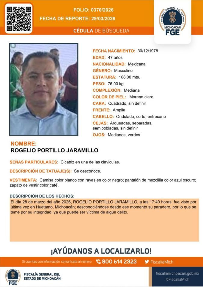 Morelia, Michoacán, 15 de abril de 2026.– La Fiscalía General del Estado de Michoacán (FGE) informó que fue localizado un vehículo calcinado, propiedad de Rogelio Portillo Jaramillo, delegado del Bienestar en la región, quien se encuentra reportado como desaparecido.