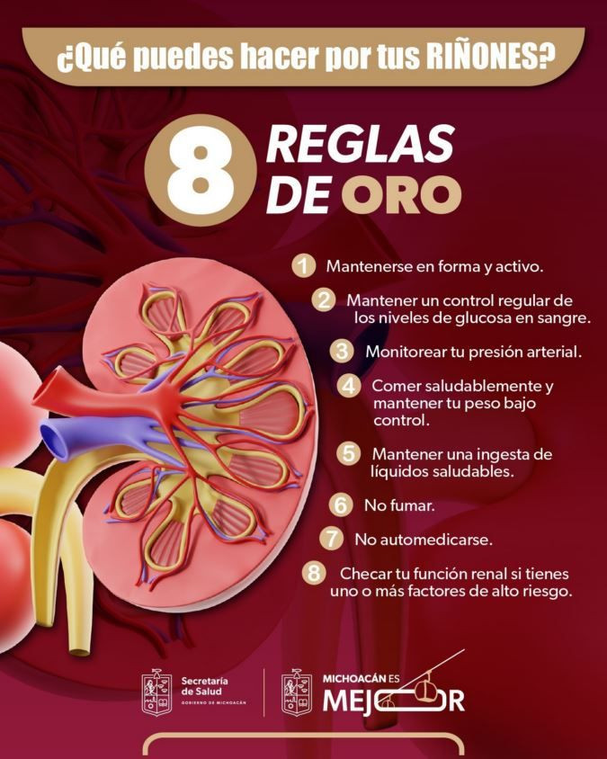 Morelia, Michoacán, 22 de abril de 2026.- La Secretaría de Salud de Michoacán (SSM) da a conocer las ocho “reglas de oro” para mantener los riñones sanos y funcionales, y promover la salud integral de la población.